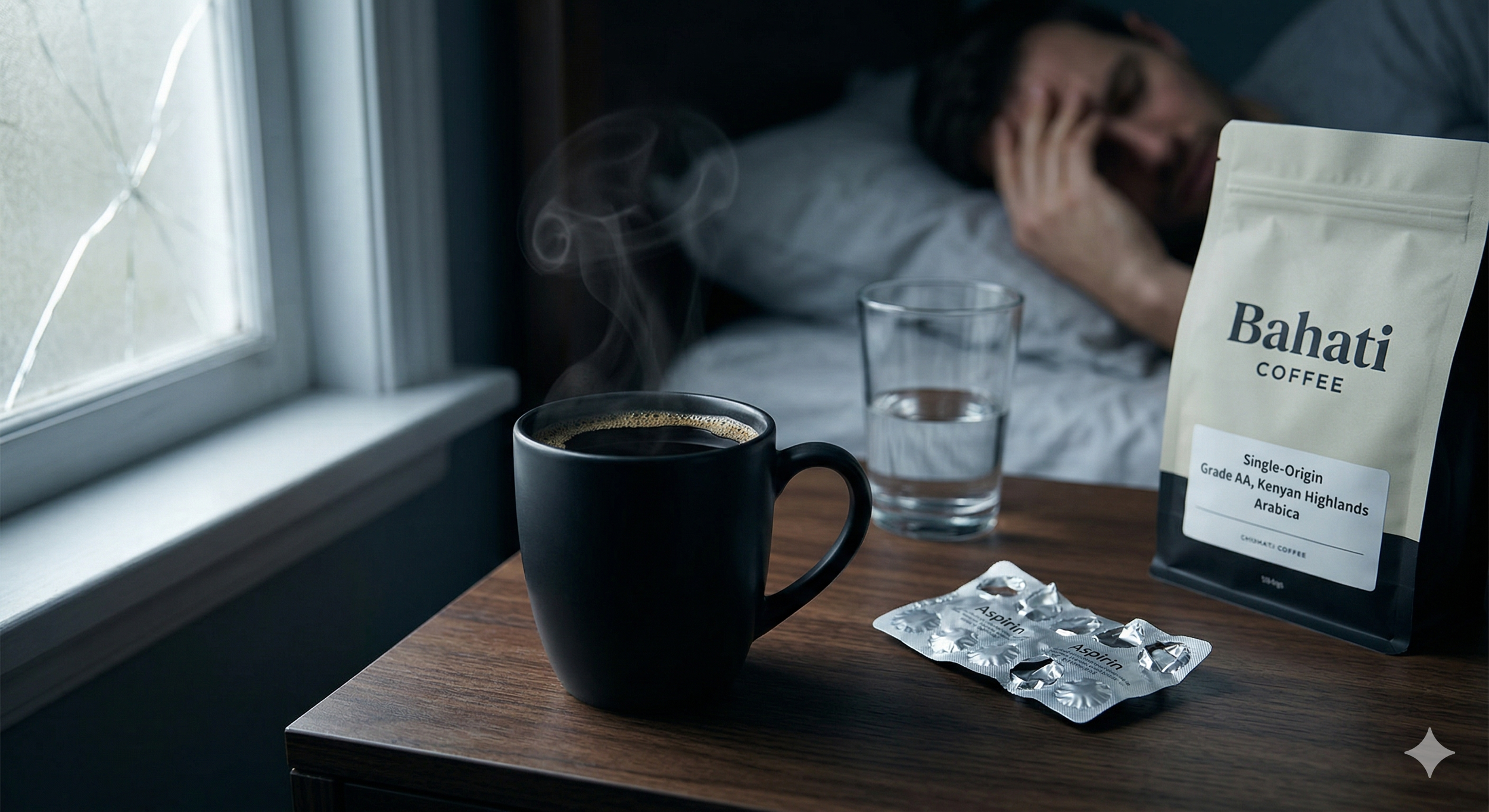 A moody close-up on a dark wood bedside table of a steaming matte black mug of Bahati Coffee next to an empty aspirin packet, representing premium Bahati Grade AA Kenyan Arabica coffee acting as a biological hangover cure and vascular headache relief on a quiet Sunday.