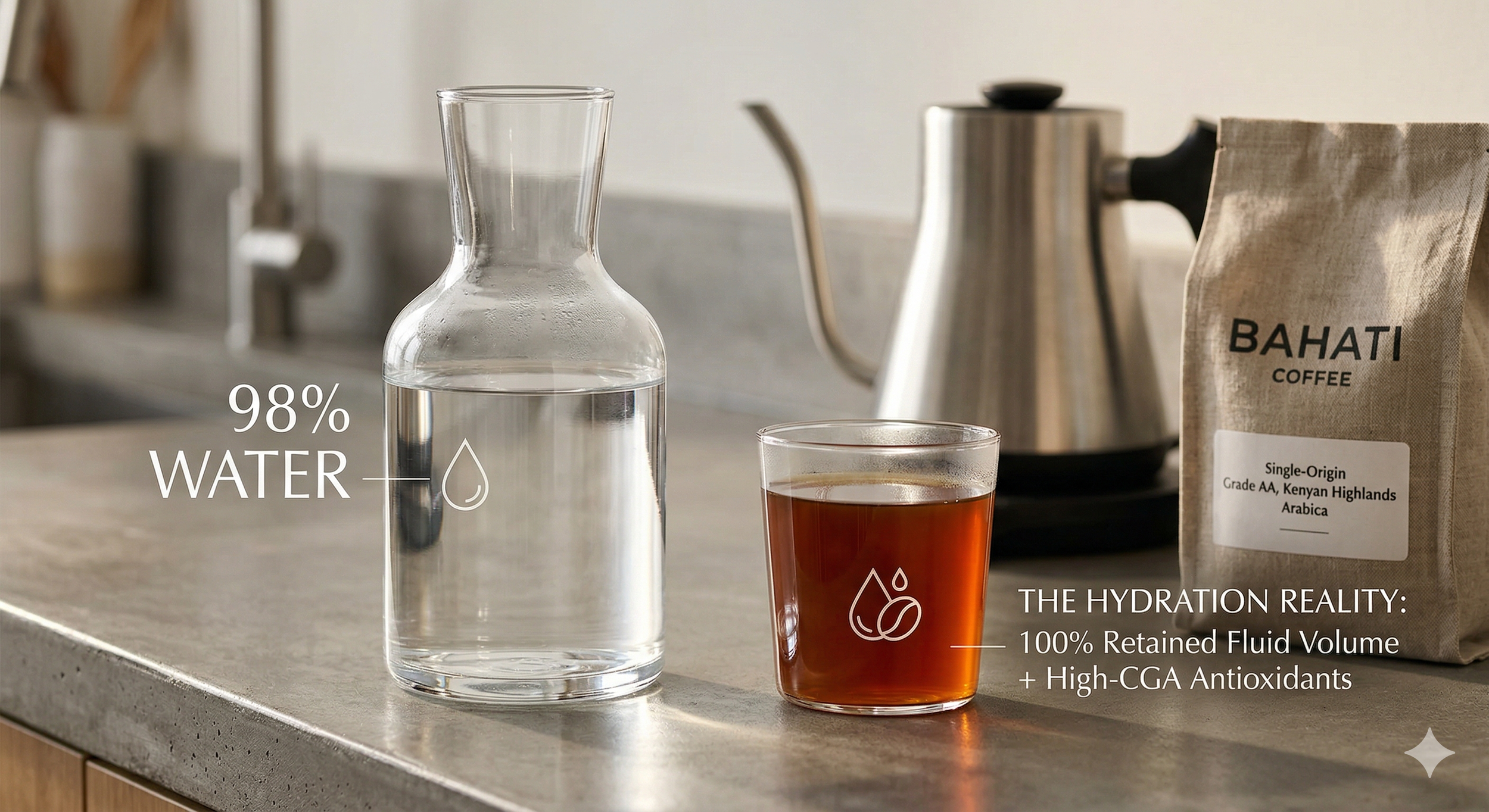 A high-end, minimalist visual visualizing the coffee hydration myth. On the left, a glass carafe of fresh water labeled "98% WATER," and on the right, a glass tumbler of brewed Bahati Coffee (Kenyan Highlands Grade AA Arabica) labeled "THE HYDRATION REALITY: 100% Retained Fluid Volume + High-CGA Antioxidants," demonstrating that quality coffee does not cause dehydration.